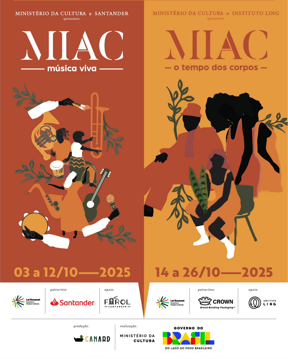 São duas edições integradas: Música Viva, realizada em parceria com o Farol Santander, de 03 a 12 de outubro, e O Tempo dos Corpos, com o Instituto Ling, de 14 a 26 de outubro. A MIAC também ocupará espaços como o Galpão Floresta Cultural, a Casa de Cultura Mario Quintana, a Cinemateca Capitólio, o Teatro Simões Lopes Neto e o Estúdio Stravaganza.